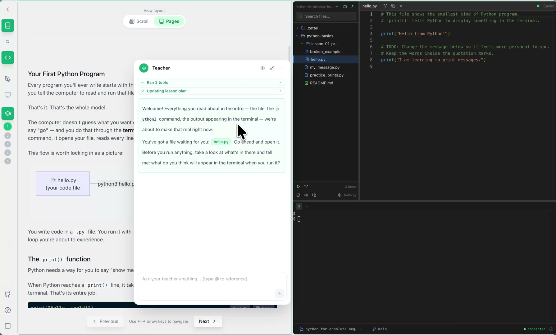 Every lesson drops you into a full coding workspace with a terminal, file explorer, and an AI teacher in the sidebar. You build things. The exercises check that you actually understand what you built.