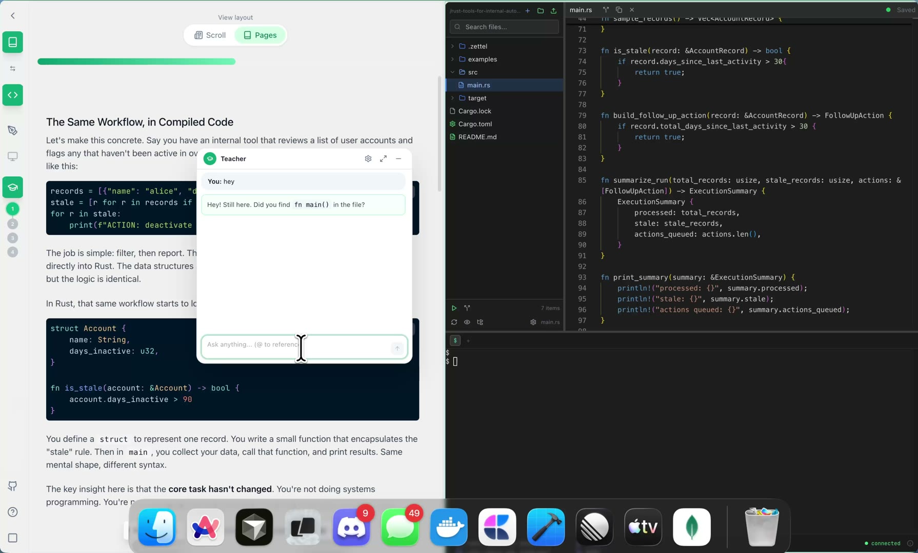 Tell Zettel what you want to learn. It builds your curriculum, drops you into a real coding workspace, and teaches you with an AI tutor that watches your work and guides your thinking.